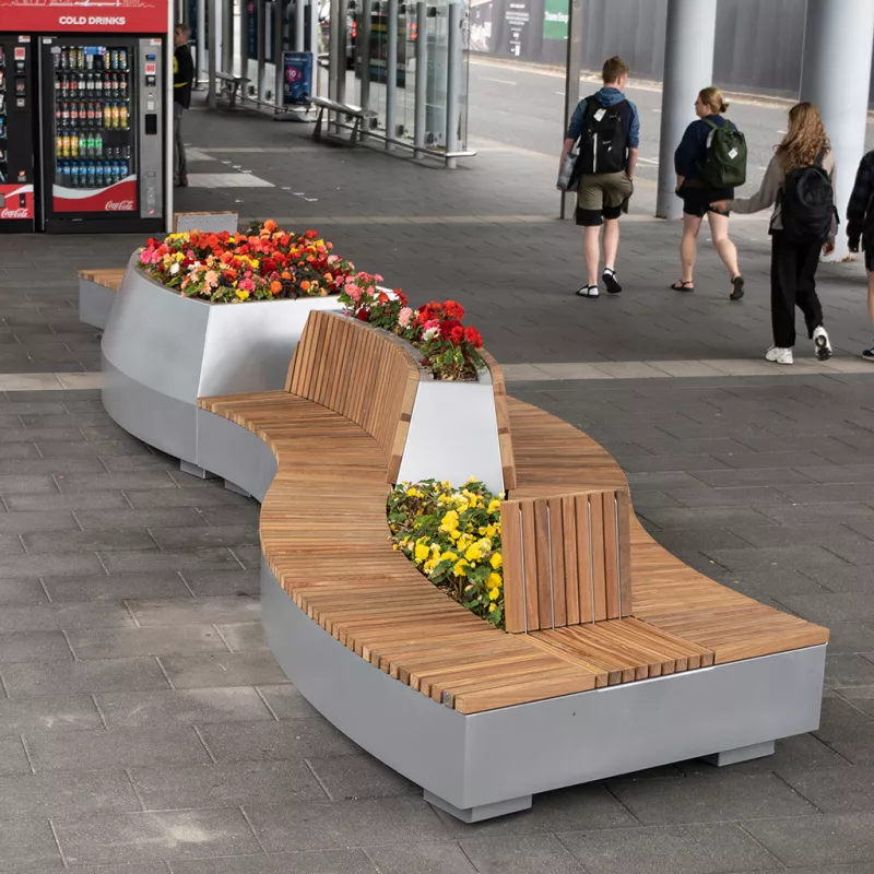 - Large gamme de sièges droits et courbes combinés avec des jardinières pour arbres et des îlots de verdure