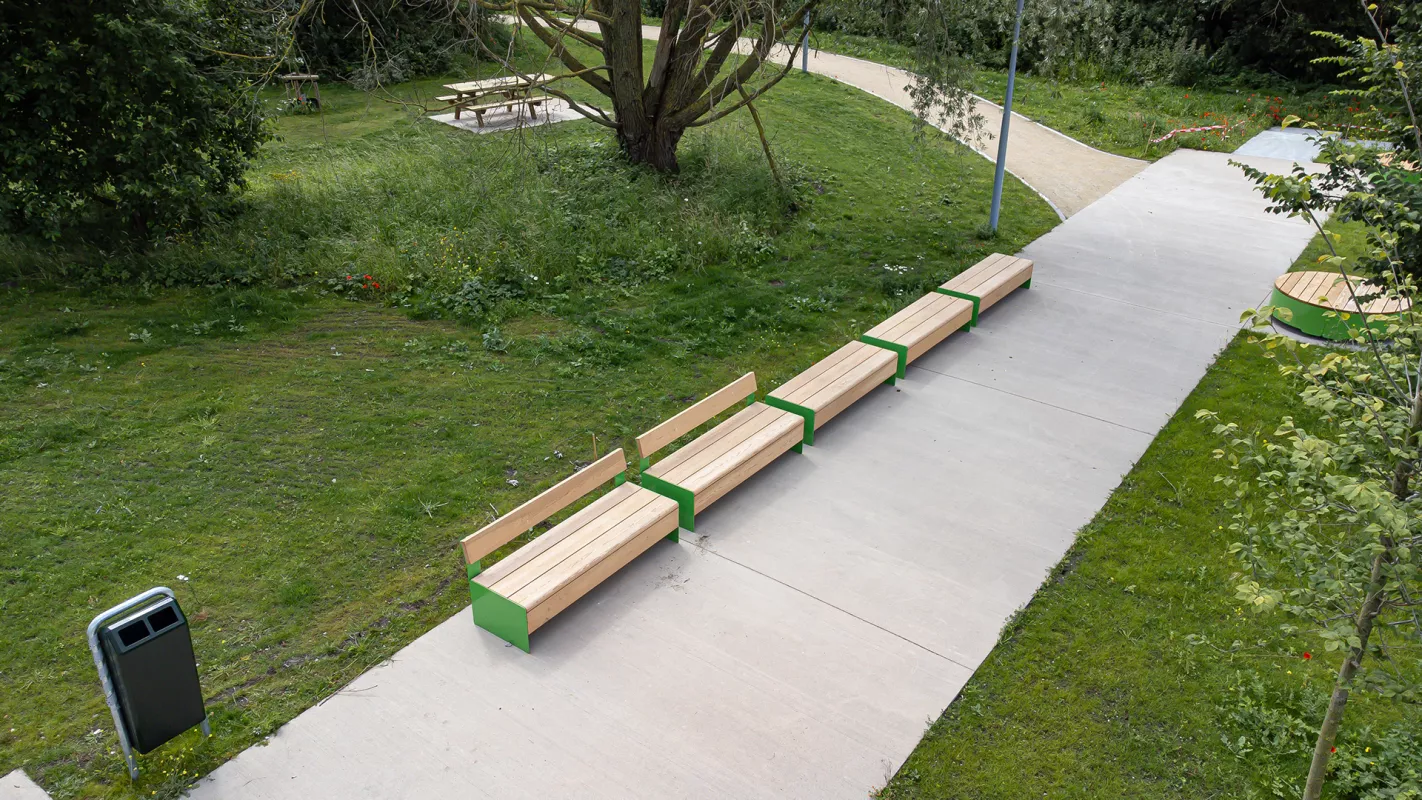 Un mobilier en béton robuste mérite un bois qui l’est tout autant. Dès lors, ce mobilier urbain est réalisé en bolondo, également connu sous le nom de tali. Ce bois africain est issu d'une gestion forestière responsable et est certifié FSC. Le bolondo appartient à la classe de durabilité 1. C'est un bois très stable qui convient particulièrement à la fabrication de longues pièces de banc. Sa belle couleur chaleureuse est renforcée par l'application d'huile monocouche 100 % écologique. Sous l'influence du soleil et de la pluie, le bois prend une teinte grise uniforme au fil du temps.