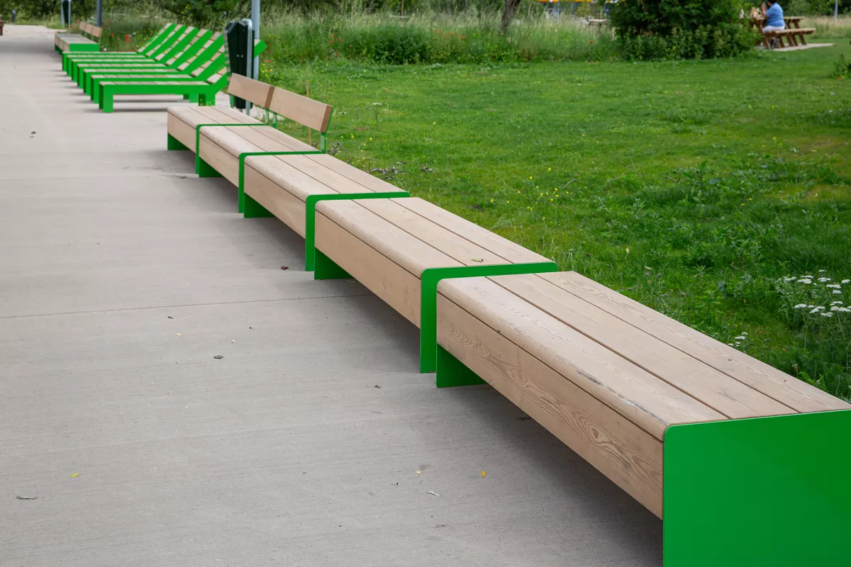 Banc bas 3 places avec ou sans dossier et pouf. Design complexe et moderne avec des lattes en bois certifié FSC soigneusement arrondies qui épargnent les creux des genoux.
