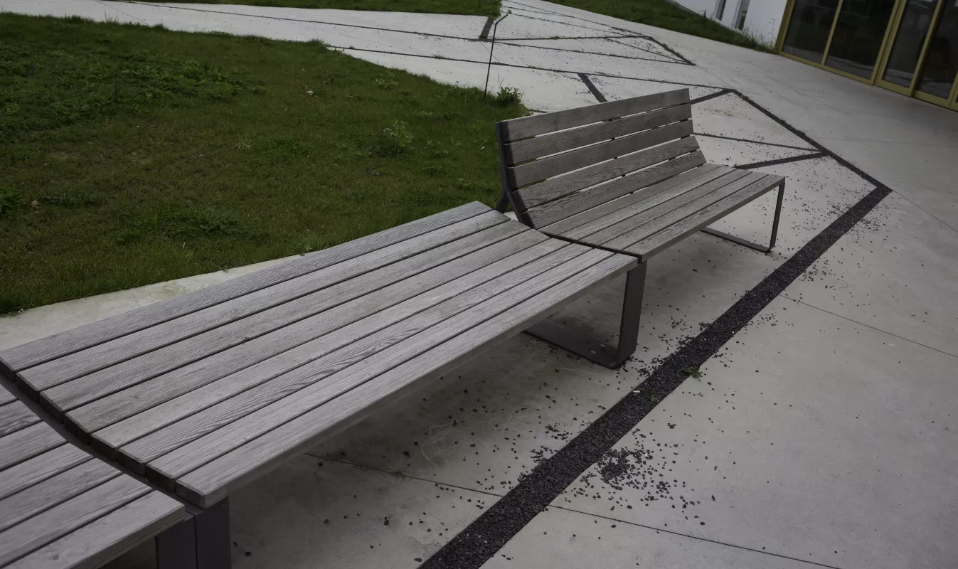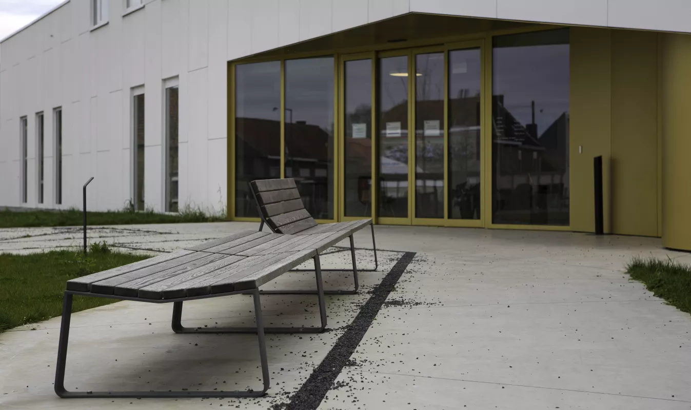 En 2012, un concours a été organisé par l'architecte du gouvernement flamand pour la conception d'un centre administratif dans la municipalité de Staden (Ac / Dc), avec Volt Architecte comme lauréat. Le bâtiment devait faire partie intégrante d'une nouvelle zone verte à construire, réalisée par l'Atelier Gras. Le mobilier a été choisi pour les bancs en mélèze MAYFIELD © de Miramondo en Autriche.