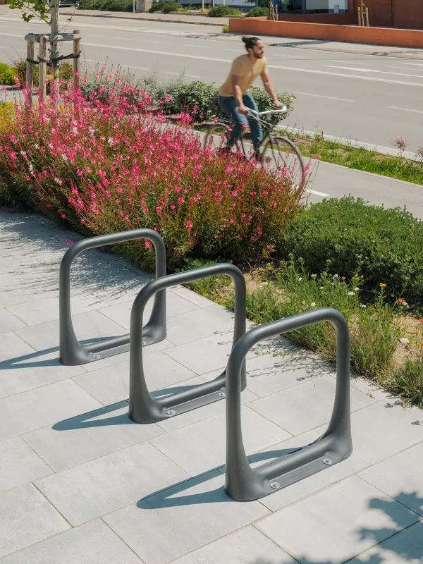 Nomad© est fabriqué en plastique PE recyclé et renforcé à l'intérieur par un câble en acier inoxydable. Nomad© est doté de 4 points d'ancrage pour une installation facile sur une surface pavée.